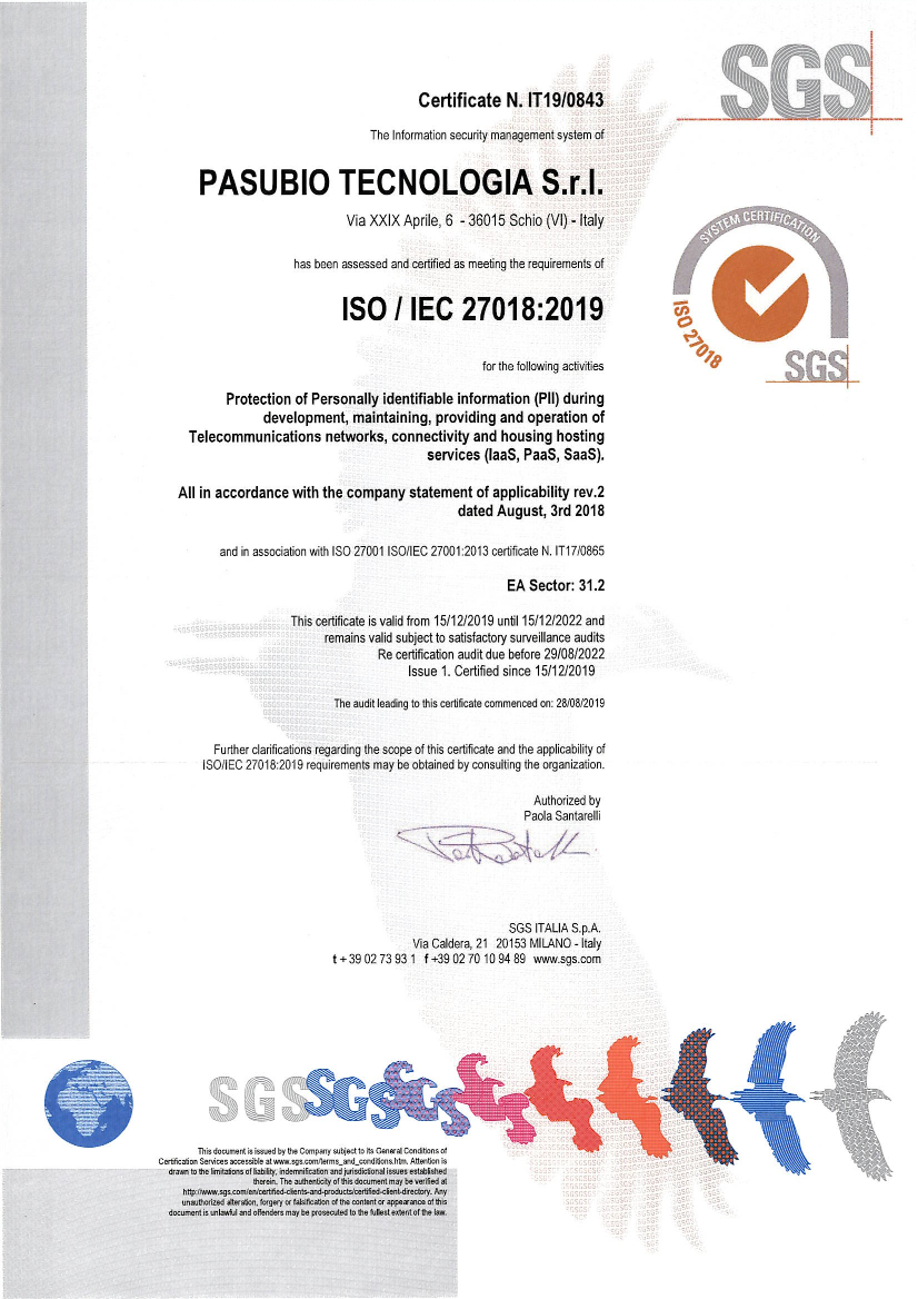Descrizione Tipologia di documento Certificazione 2022 PST ISOIEC27018 2019 ITA (File pdf 1,46 MB) 2019 PST ISOIEC27018 2019 ENG (File image/jpeg 483,93 kB) Ufficio responsabile/proponente del documento Pasubio Tecnologia Ulteriori dettagli